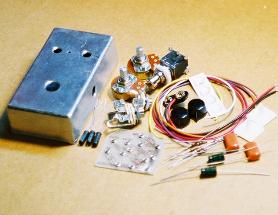 Degree of difficulty: 4 out of 5 An absolute must have for any fuzz lover. The Colorsound MKII "2 knob tonebender" has massive amounts of fuzz and sustain and can produce controllable feedback even at low volume levels. This circuit is considered to be the best by many fuzz connoisseurs. Comes with everything seen here*: *Drilled enclosure (MXR size) *Point to point glass epoxy circuit board *Selected NOS Mullard OC75 transistors *Xicon Capacitors *Xicon resistors *Neutrik 1/4" jacks *Alpha potentiometers *Alpha DPDT switch (true bypass) *Black Pointer knobs *Self-adhesive circuit board stand-offs *Battery snap *Self-adhesive rubber feet *Hook-up wire *Online Instructions |