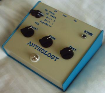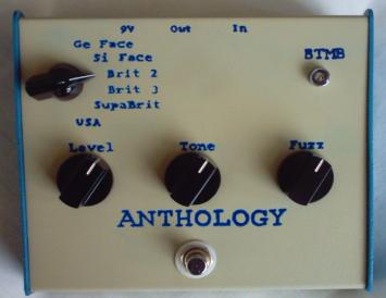 The Anthology Fuzz is 6 of the most coveted fuzzes ever in one single pedal. It uses 4 Nos germanium transistors and 4 silicon transistors. This isn't digital modelling. This is pure analogue bliss. Ge Face: An exact clone of the most famous fuzz pedal ever, The Fuzz Face, with 2 NOS Mullard OC75 germanium transistors. (the tone knob is not engaged here in order to preserve tonal accuracy) Click Si Face: Uses the same circuit as the Ge Face, but switches out the germanium transistors for silicon and rebiases the circuit. The tone knob still is not engaged. Brit 2: This is an exact clone of the SolaSound ToneBender MKII (2 Knob Tonebender). The MKII circuit was 100% identical to the original FuzzFace, but SolaSound added an extra transistor stage to the beginning of the circuit. The Brit 2 circuit switches the first 2 transistors back to germanium and engages an extra germanium transistor stage in front of the Face circuit. Brit 3: This is based on the Colorsound ToneBender MKIII (3 Knob Tonebender). It switches back to germanium transistors and adds a 3rd stage with another germanium transistor and additional circuitry and also engages the tone knob. SupaBrit: Based on the Colorsound SupaTonebender. It switches all 3 of the transistors to Silicon and kicks in a diode clipping stage. USA: Can't forget the Big Muff. Little known fact, but the BMP is a straight up clone of the Supa Tonebender with a 4th transistor stage at the end. So can you guess what happens when you turn the switch to "USA"? A 4th stage is engaged with another silicon transistor and additional circuitry. |
