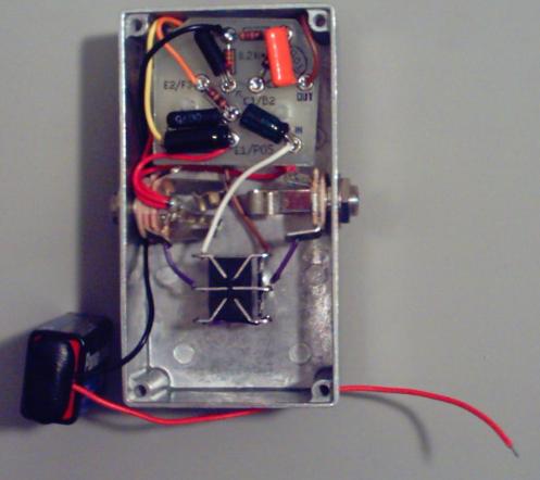Step 1: Trim the BLACK wire of the battery snap so that it is the proper length to reach from the "NEG" eyelet of the circuit board (this is also where the 33k and 470ohm resistors meet) to the BATTERY SPACE. It's a good idea to have a 9v handy so you can attach it to the snap and measure with the battery actually in the space. You don't want to give the black wire too much slack, but you want to give it enough slack so that you can change your batter without having to tug on the wires too much. Strip 3mm off the end of the trimmed BLACK wire of the BATTERY SNAP and solder it to the "NEG" eyelet. Your pedal should look like the pic below when you have finished step 1. Note that the black wire is passed under the IN jack to help keep it out of the way when changing the battery. This is not necessary, but it's a good idea to do so.