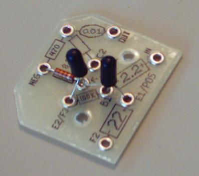 The red circle indicates where the solder joint will be made. There will only be one solder joint made for each step in the circuit board populating process. Even though there is only one solder joint being made, there may be multiple component leads that are joined at this joint. Here, for example, there are three different component leads at this joint: the collector of transistor 1, the base of transistor 2, and the 33K resistor (see orientating the transistor to learn more about the collector and base). Each diagram will also be accompanied by a close-up photograph of what the circuit board should look like at that step in the populating process. If you look at the picture below you will see transistor 1, transistor 2, and the 33K resistor all soldered where the red circle in the diagram is. There will also be correlating diagrams and photograph for the assembly and wiring process.