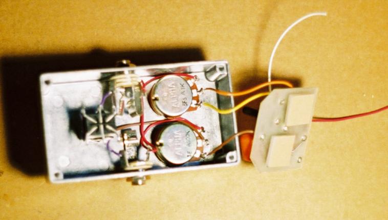 Step 2: Trim the yellow, orange, and brown wires so that they are long enough to reach the solder lugs if you are holding the top edge of the circuit board against the top lip of the enclosure. They should only be about 2 1/2" to 3" long. Strip 3mm off each of the ends. Solder the orange wire coming off the S2 eyelet of the circuit board to LUG 2 (center) of the 1K pot (sustain knob). Solder the yellow wire coming off the S3 eyelet of the circuit board to LUG3 of the 1K pot. Solder the brown wire coming off the OUT eyelet of the circuit board to LUG3 of the 500K pot (volume knob). Your pedal should look like the picture below after Step 2.