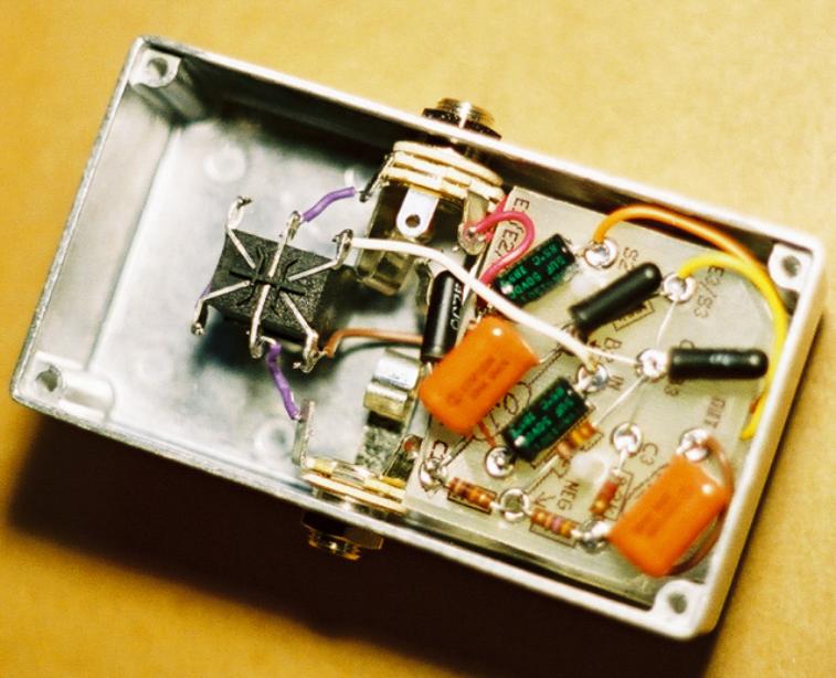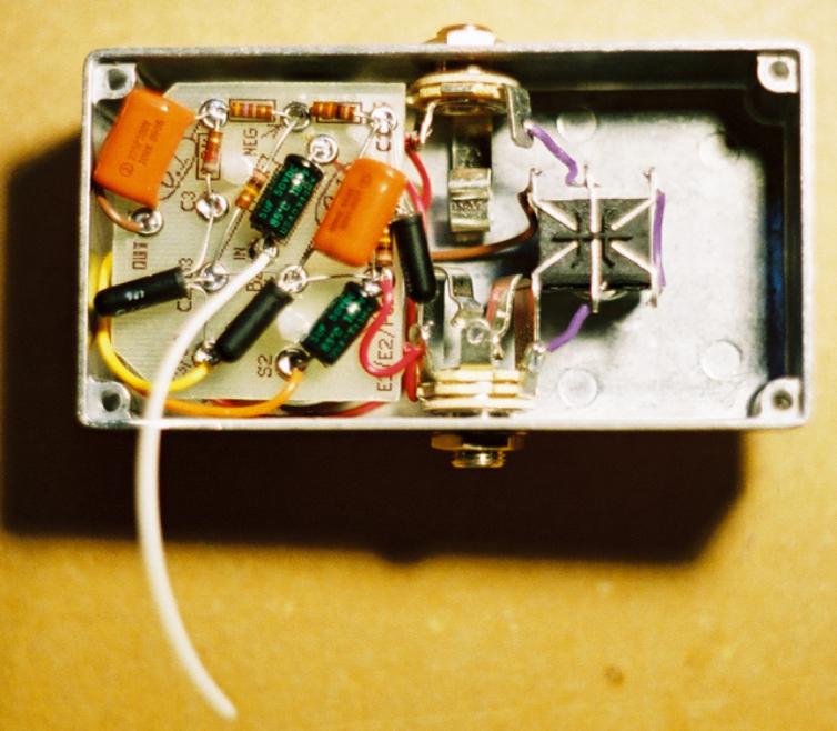 Step 3: Trim the red wire coming off the POS eyelet of the circuit board so that it is long enough to reach the RING of the IN JACK. Strip 3mm off of the end of the red wire and solder it to the RING of the IN JACK. NOTE: The distance from the the POS eyelet and the Ring of the IN Jack will be very short. You may need to leave the red wire a little longer so that you are able to strip on end of it. If you need to do so, just tuck the excess wire to one side out of the way. Your pedal should look like the picture below when you are finished with step 3.