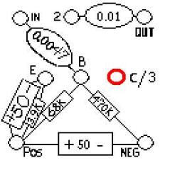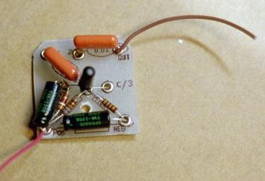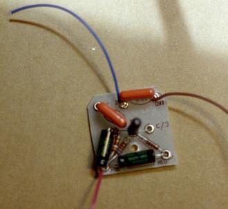 Strip 3mm off one end of the brown wire. Solder the brown wire and the .01uF (104K) orange drop capacitor to