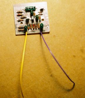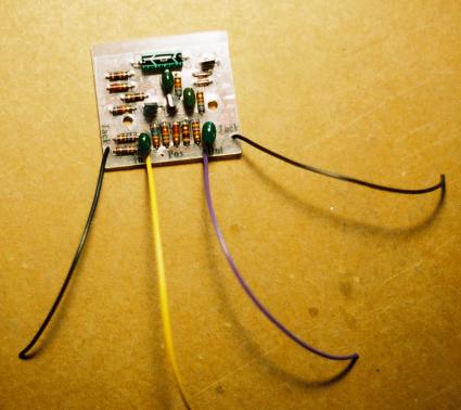 Strip 3mm off one end of both the yellow and purple wires. Solder the yellow wire to the hole labelled "In" and the purple wire to the hole labelled "Out"