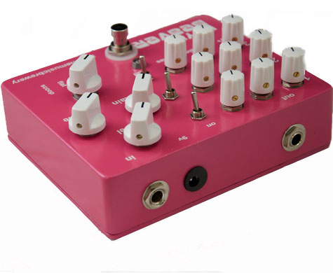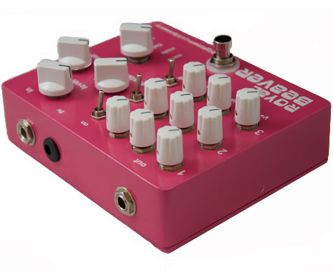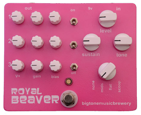 The BigToneMusicBrewery Royal Beaver features all panel mounted hardware, including open frame Neutrik jacks, true mechanical bypass, and is soldered, wired, and assembled completely by hand in the USA. The pedal is topped off with a pink or purple LED (we can't decide which color we like better).
