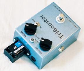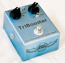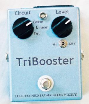 A simplified version of the QuattroBooster. The TriBooster gives you 3 of the most popular boosts ever in one single pedal that's very easy to use. The circuit selector knob can choose from a germanium boost, linear power boost, or a MosFET clean boost. A single level knob controls them all. There is a "Hi/Mid" toggle switch which affects ONLY the germanium boost, making it either an exact clone of the Dallas Rangemaster Treblebooster when in "Hi" or a natural boost without cutting your bass response when in "Lo" and allows more of your natural tone to come through. "Mid" does NOT turn the germanium boost into a dark boost or mid boost.